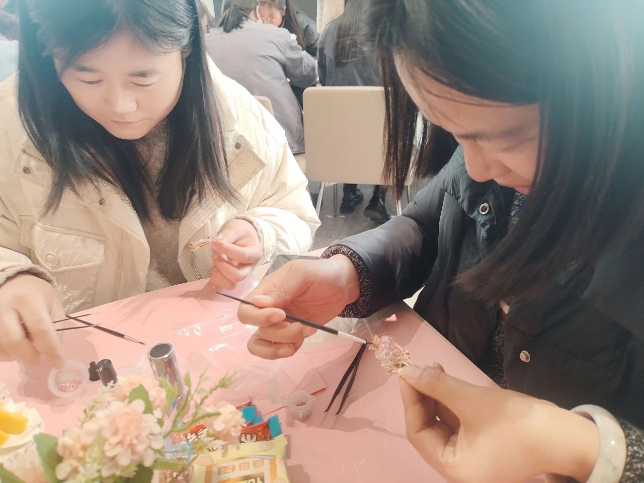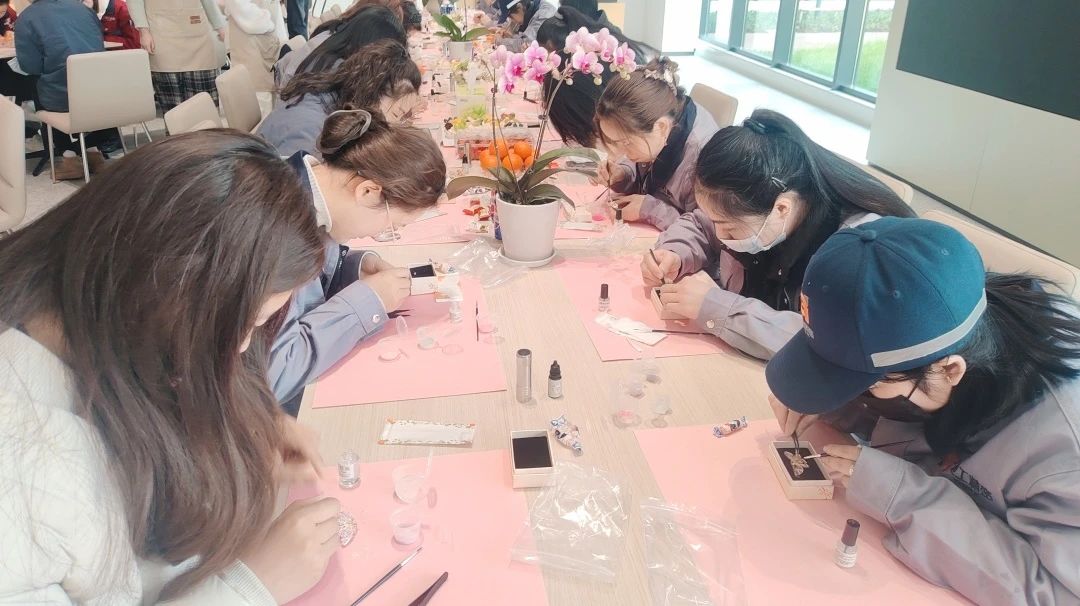 與此同時,常熟分公司的非遺螺鈿胸針制作活動,將傳統(tǒng)技藝融入現(xiàn)代職場。螺鈿工藝傳承人現(xiàn)場講解千年技藝的歷史與精髓,女員工們化身“巧手匠人”,在貝母的流光中雕琢匠心:挑選螺片、設計紋樣、鑲嵌打磨……方寸之間,花鳥紋樣盡顯江南雅韻,幾何構(gòu)圖呼應現(xiàn)代審美?;顒硬粌H讓員工體驗了非遺文化的魅力,更讓她們感受到公司對女性精神生活的重視。